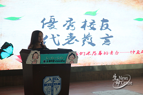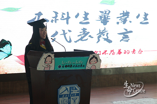 优秀员工代表邱槿怡带着给毕业生的赠言来到现场,当她说到珍惜身边人时,建议毕业生们拥抱座位旁的同学,同时她希望大家能尽早适应社会。教师代表黄新河希望同学们铭记“感恩、进取、信誉”,并祝毕业生们前程似锦。