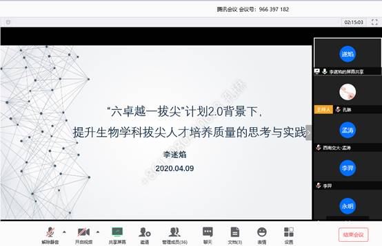 李遂焰、李萍、周嘉裕、廖海、黄新河几位老师探讨了在“六卓越一拔尖”计划2.0背景下,如何提升生物学科拔尖人才培养质量的相关问题。周嘉裕以《分子生物学》模块化教学的改革为切入点,力争克服该课程重点难点繁杂、知识点更新迭代太快给教学带来的困难。廖海从产学研协同创新的角度阐述了生物学科拔尖创新人才培养的机制。黄新河结合公司国际化工作,谈到了如何让拔尖人才在国际舞台上发光发亮。李萍老师则发表了关于生物学科拔尖人才培养模式的看法。