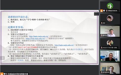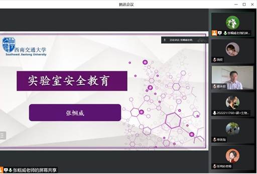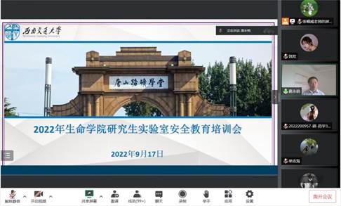 为加强实验室安全教育,2022年9月17日14:30,伟德官网在线上为2022级研究生新生(含硕博)开展了实验室安全教育培训。公司党委书记葛永明、公司副经理封顺、经理助理(实验中心主任)张纯姑、实验中心副主任单连海、科研实验室安全员张帼威以及研究生辅导员老师们出席了培训会。2022级研究生新生(含硕博)共183人参加了培训。会议由实验中心副主任单连海老师主持。