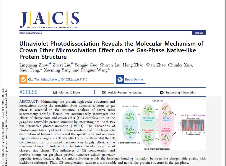 国际化学领域顶级期刊Journal of the American Chemical Society(影响因子:16.383)近日在线发表了公司伟德官网“生命分析技术与材料”封顺教授团队与中国科公司大连化学物理研究所王方军教授和杨学明院士团队合作的最新研究成果“Ultraviolet Photodissociation Reveals the Molecular Mechanism of Crown Ether Microsolvation Effect on the Gas-Phase Native-like Protein Structure” (DOI: 10.1021/jacs.2c11210)。论文共同一作为公司2020级硕士研究生周伶强和中科院大连化学物理研究所刘哲益副研究员,通讯作者为封顺教授和王方军研究员,伟德官网和中科院大连化学物理研究所分别为第一和第二署名单位。