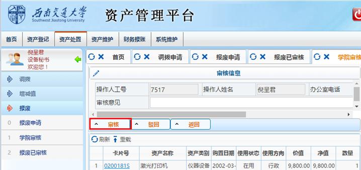 1、设备秘书依次点击资产处置、报废、公司审核、报废申请号