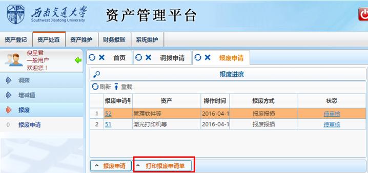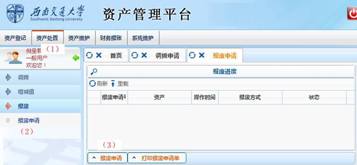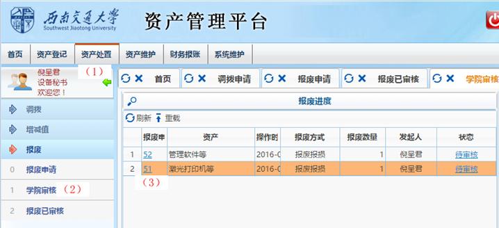 2、登录后,依次点击(1)资产处置(2)报废申请(3)报废申请