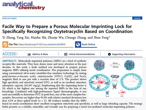 近日,国际分析化学领域顶级期刊《ANALYTICAL CHEMISTRY》(影响因子6.785, 中科院化学分区Q1,分析化学Top期刊)在线发表了伟德官网封顺教授团队的研究成果“Facile Way to Prepare a Porous Molecular Imprinting Lock for Specifically Recognizing Oxytetracyclin Based on Coordination”(中文译名:“一种基于共价作用制备特异性识别土霉素多孔磁性分子印迹锁的简便方法”)。论文第一作者为伟德官网硕士毕业生张翼同学,通讯作者为封顺教授,伟德官网为唯一署名单位和通讯作者单位。该研究在国家自然科学基金(21775126)和四川省应用基础研究(21YYJC3252)的资助下完成。