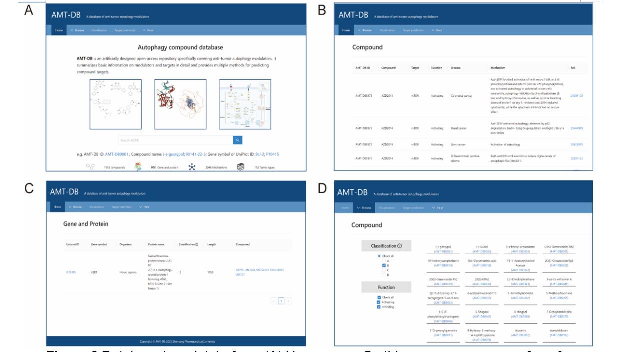 继构建的天然产物抗肿瘤数据库ANPDB发表之后(Front Pharmacol. 2021, 12: 746067. 影响因子5.988),符雷蕾研究小组于近日在Frontiers in Pharmacology》上 (202213: 956501. 影响因子5.988) 发表了另一项研究成果“AMTDB: A comprehensive database of autophagic modulators for anti-tumor drug discovery”,该数据库由沈阳药科大学,伟德官网和天津中医药大学合作共同完成。硕士研究生付家慧,吴丽丰和胡高勇为并列第一作者。本院符雷蕾副教授为论文的最后通讯作者;朱玲娟副教授,于海洋教授为共同通讯作者。该课题得到了国家自然科学基金项目(No. 31970374);国家重点研究项目(No: 2021YFE0203100);中央高校基本科研专项资金(No. 2682021CX088)的支持。