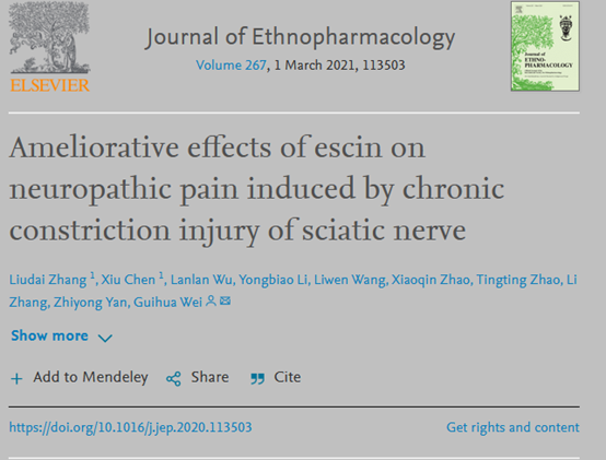 公司张留代硕士在JOURNAL OF ETHNOPHARMACOLOGY发表了题为“Ameliorative effects of escin on neuropat...